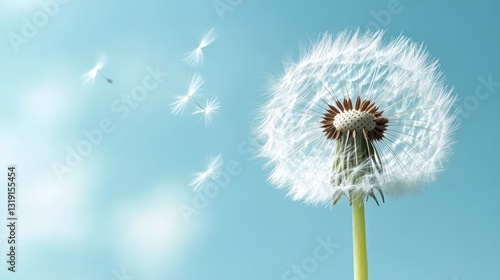 This dandelion stands majestically against a bright blue sky, emphasizing its delicate structure, symbolizing hope and the beauty of nature, perfect for evoking emotions of freedom.