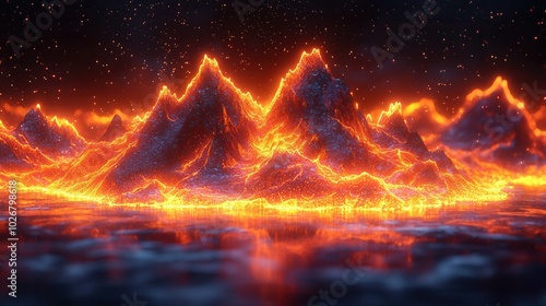 This digital artwork features glowing lava mountains on a dark background, creating a vibrant and captivating landscape filled with fiery colors.