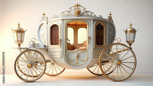 This enchanting carriage, adorned with whimsical designs and intricate details, invites imagination with its open door, set against a bright white backdrop.