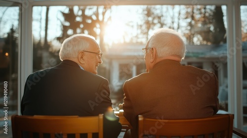 This heartwarming image showcases two elderly men enjoying a sunset together, reflecting friendship and the beauty of companionship in their golden years.