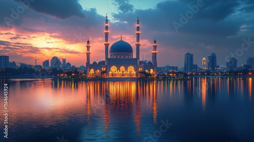 This image captures a stunning sunset view of a mosque, reflecting on a serene lake with city skyscrapers in the background. A beautiful blend of culture and nature.