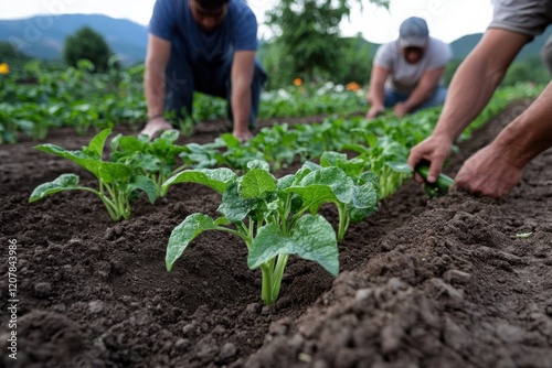 This image captures individuals planting young vegetable seedlings in fertile soil, showcasing the diligence of agricultural work and the beauty of nature.