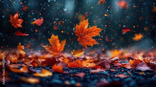 This image captures the dramatic descent of autumn leaves amidst a dark background, showcasing the rich colors of fall and the poignant beauty of nature's transition.
