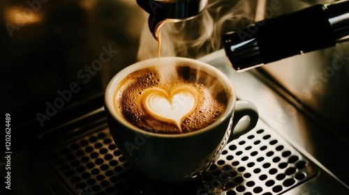 This image captures the steaming allure of a freshly brewed cup of coffee, topped with meticulously crafted frothy heart art, symbolizing love and art in everyday life.
