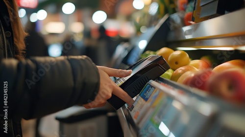 grocery, smartphone, checkout, client, technology, convenience, modern, hand, supermarket, produce, apparently, scanner, cart, casual attire, jacket, fruit, vegetable, selfservice, efficiency, barcode, apple, purchase, transaction, retail, consumerism, security, cashless, innovation