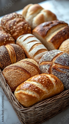 This image displays an appealing variety of different loaves of bread inside a warm wicker basket, highlighting their unique textures and inviting appearance, making them irresistible.