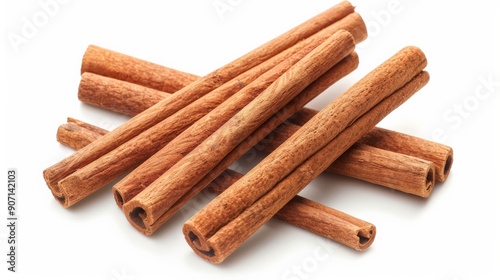 This image displays neatly arranged cinnamon sticks on a white background, emphasizing their natural brown hue and coarse texture, perfect for aromatic culinary purposes.