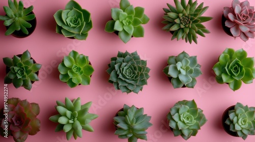 This image features a top-down view of various succulent plants neatly arranged in small pots on a soft pink background, highlighting their diverse shapes and colors.