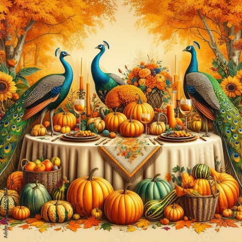 This image features an elegant table adorned with pumpkins, fruits, and flowers, surrounded by vibrant autumn foliage and graceful peacocks. The rich colors and intricate details create a luxurious