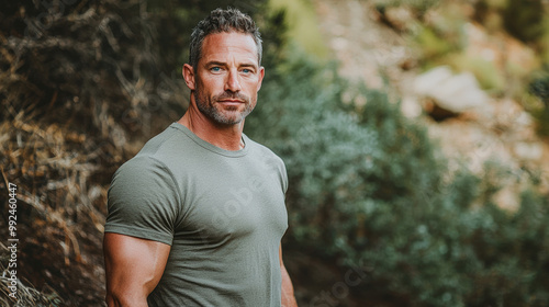 muscular, man, greenery, confident, strength, fitness, nature, portrait, male, athletic, casual attire, shirt, rugged, photogenic, healthy, lifestyle, summer, sunlight, tree, landscape, fit, masculine, expression, body