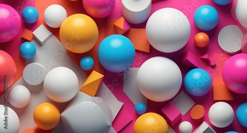 This image presents a vibrant, playful overhead view of various 3D geometric shapes, including spheres, cubes, and pyramids, scattered across a bright pink surface. The diverse sizes and colors.