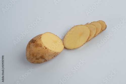 This image shows a fresh potato that has been partially sliced into thin, even rounds. The potato’s skin is light brown and slightly rough, while the inside is a pale yellow, indicating its freshness
