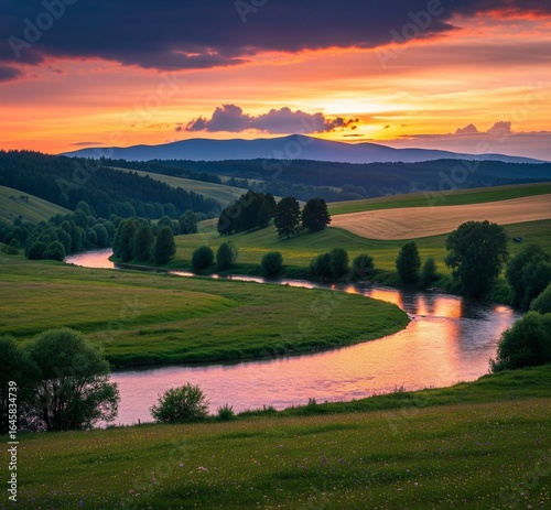 This is a picture of a natural landscape showcasing a river winding through vast green meadows, with hills and mountains in the background, under a colorful sunset sky.
