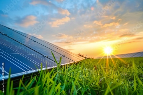 This is an image featuring solar panel cells against the dramatic sunset sky background, a clean alternative power energy concept.