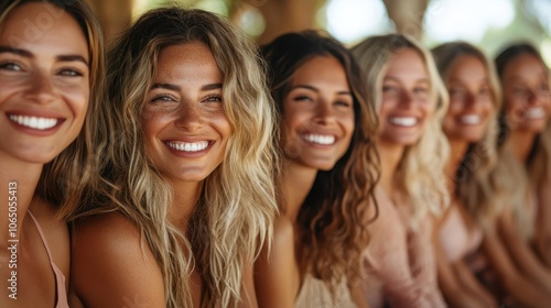 This lively image depicts a group of smiling women seated together in a relaxed setting, exuding a sense of camaraderie, joyful connection, and shared contentment.