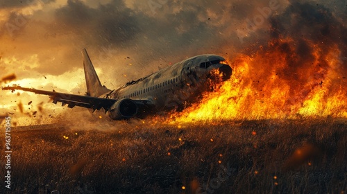 This powerful image vividly depicts a catastrophic airplane crash, showcasing intense flames, billowing smoke, and scattered debris in the midst of a chaotic emergency landing scenario