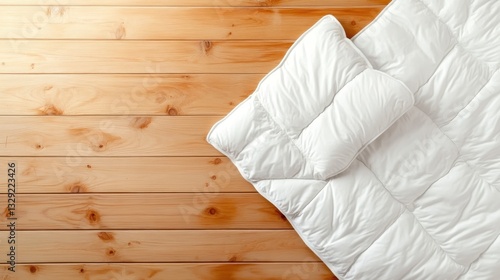 This serene image features a soft, plush white comforter gracefully arranged on a natural wooden floor, inviting an atmosphere of relaxation, comfort, and homeliness to the viewer.
