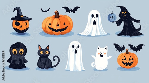 This set of illustrations features spooky Halloween characters like the Grim Reaper, ghosts, pumpkins, and a cute cat. They're perfect for party costumes or designs.