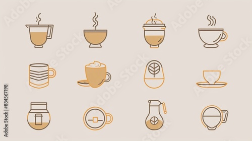 This set of stylized coffee cups and accessories presents elegant and aesthetic designs, perfect for visually appealing representations of coffee culture and its accessories.