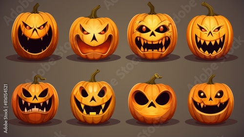 This set portrays various fierce and funny carved pumpkin faces against a muted background