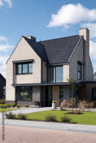 modern, home, architecture, suburban, neighbourhood, contemporary, design, landscaping, large, window, clear, sky, sleek, line, residential, area, living, brick, exterior, natural, light, front, yard, plant, arrangement, warm, weather, feature, peaceful, environment, stylish, house, community, summer, day, aesthetic, comfort, space, green, grass, tree, driveway, building, structure, sunlight, architectural, beauty, serene