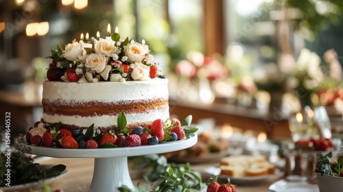This stunning cake features a rich, creamy frosting adorned with fresh roses, strawberries, and blueberries, making it a perfect centerpiece for any special celebration.