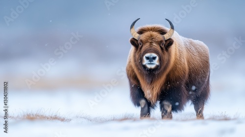 This stunning image presents a magnificent musk ox standing amidst a snowy backdrop, showcasing its impressive horns and thick fur, embodying resilience and strength in winter.