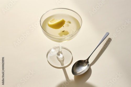 silverware, dairy, drink, crockery, stemware, table, food, indoor, cup, tableware, spoon, empty, refreshing, vibrant, summer, nourishing, elegant, crystalline, transparent, zesty, invigorating, garnished, lemony, sparkling, effervescent, chilled, fragrant, enticing, mouth-watering, crisp, gold, radiant