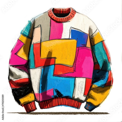 This sweater is a modern canvas of geometric abstraction, featuring bold shapes and bright colors for a statement-making ensemble.