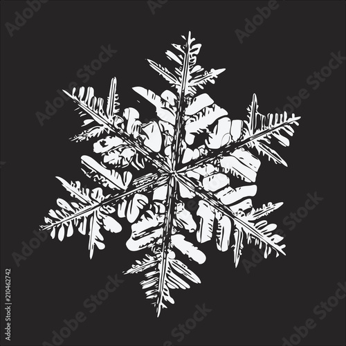 This vector illustration based on macro photo of real snowflake: large stellar dendrite snow crystal with fine hexagonal symmetry, complex ornate shape and six long, elegant arms with side branches.
