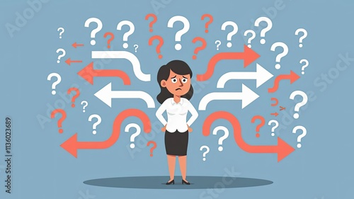 This vector illustration features a woman standing in a contemplative pose surrounded by question marks and arrows symbolizing choices and uncertainty