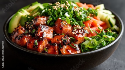 poke, bowl, tuna, fresh, healthy, vibrant, favor, colourful, garnished, sesame, vegetable, avocado, meal, ingredient, salad, cookery, alimentary, seafood, food, presentation, culinary, ethnicity, summer, modern, wellness, lifestyle, epicure, freshness, savoury, peaceful, happiness, comfort, taste, art, photo, high, quality, dish