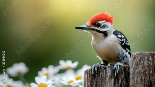 This vibrant woodpecker with a striking red crest perches on a wooden fence post, showcasing its beautiful plumage against a blurred floral background, indicating nature's charm.