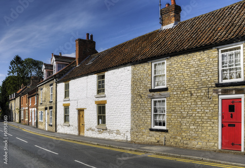 architectural, architecture, blue, building, distance, dwelling, england, english, exterior, front, home, house, old, outdoors, outside, quaint, recede, receding, residential, road, roadway, sky, stone, street, terraced, village
