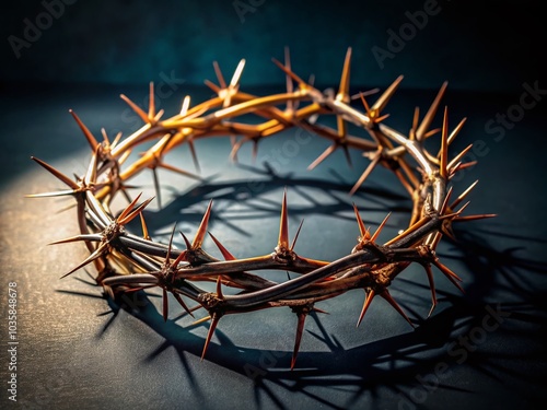crown, thorn, crucifiction, shadow, royalty, dark background, symbolism, gothic, faith, sacrifice, nature, artistry, spirituality, elegance, contrast, depth, woven, branch, silhouette, king, queen, mystique, power, emotion, texture, representation, dark, light, hope, despair, resilience, tradition, culture, creativity, contemplative, narrative, imagery, darkness