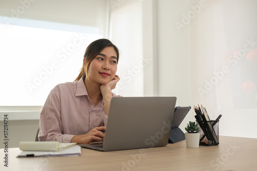 Thoughtful asian female employee using laptop at her office desk. Lifestyle, technology and wireless communication.