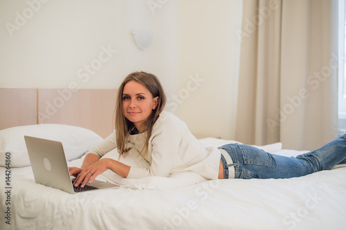 bed, home, bedchamber, female, technology, thoughtful, woman, laptop, lifestyle, computer, attractive, notebook, young, beautiful, adult, caucasian, typing, white, lying, wireless, house, indoor, using, apartment, leisure, 1, person, happy, cyberspace, work, side, morning, wi-fi, residential, cute, comfortable, youth, indoor, sitting, human, online, blond, serious, web, 20s, network, lady, bathrobe, interior