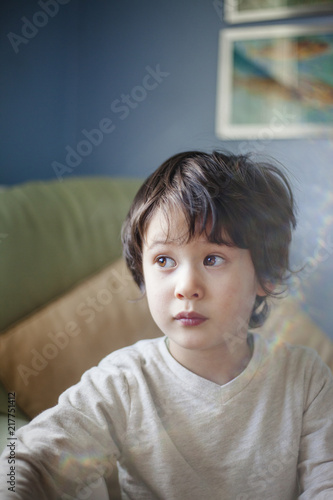 boy, thoughtful, looking away, sitting, home, childhood, contemplation, lifestyle, cute, casual clothes, brown eyes, innocence, closeup, relaxation, daydreaming, domestic life, avocation, front view, waist up, indoor, one person, male