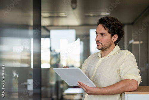 thoughtful, businessman, holding, tablet, leaning, table, office, technology, 1, people, computer, communication, adult, business, man, digital, day, occupation, casual attire, job, corporate, white, collar, men at work, service, pensive, standing, connection, wireless, portability, young, contemplation, caucasian, imagination, male