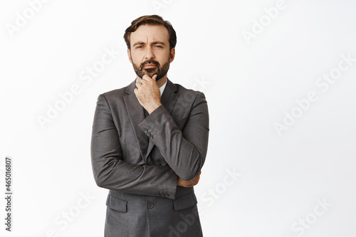 Thoughtful corporate man makes decision, thinking and looking at camera, making choice, standing in grey suit over white background