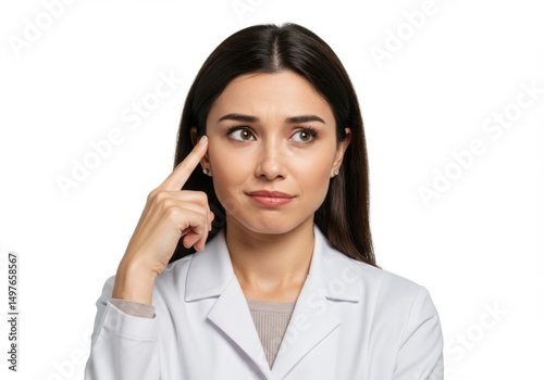 doctor, female, woman, thinking, thoughtful, contemplative, considering, idea, solution, problem solving, medical professional, health care, medicine, health, white coat, labcoat, portrait, studio shot, isolated, white background, serious, focused, concentrated, pensive, brow, forehead, finger, pointing