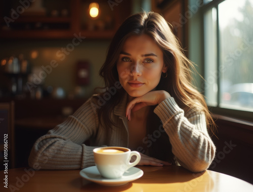 cafes, woman, hot drink, drink, cup, drinking, beauty, smile, mug, person, lifestyle, 1, outdoors, face, beverage, hot, sitting, lady, hair, brunette, casual attire