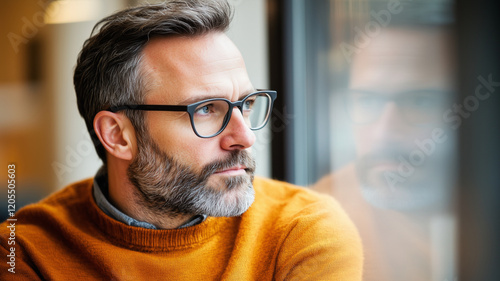 thoughtful man gazes out window, reflecting on life. His stylish glasses and warm sweater create cozy atmosphere, embodying modern business lifestyle
