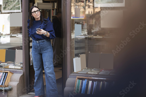 Thoughtful woman holding phone while standing at entrance of bookstore