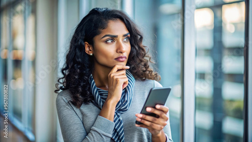 woman, smartphone, thinking, contemplation, window, indoor, casual attire, curly hair, pondering, modern, technology, serious, focused, expression, lifestyle, office, beautiful, young, adult, thoughtful, communication, decision, urban