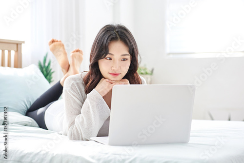 Thoughtful Young Asian Woman Working Remotely on Laptop in Bright Minimalist Home Office