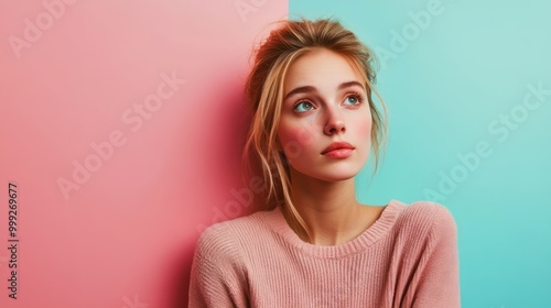 woman, female, portrait, head shot, looking, thoughtful, pensive, blond, beauty, fashion, style, elegant, make-up, contemplative, indoor, studio, pink, turquoise, background, expression, emotion, mood, person, model, girl, young, adult, solitary, introspective, wistful