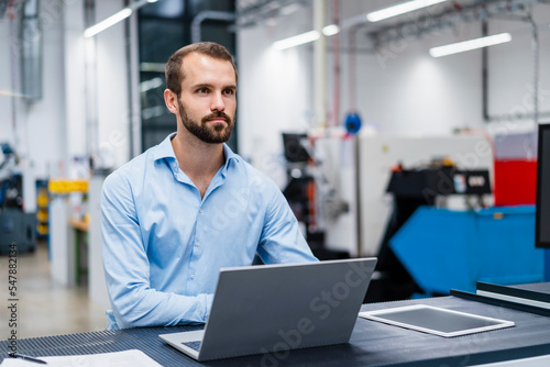 thoughtful, young, businessman, laptop, industry, copy space, technology, 1, people, computer, communication, adult, business, man, occupation, job, pensive, connection, wireless, table, shirt, caucasian, imagination, factory, industrial, building, male