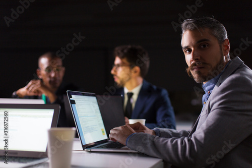 Thoughtful young man looking at camera. Group of confident young people sitting at table and working with laptops. Teamwork, working late concept