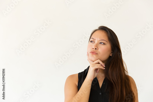 person, woman, female, young, adult, youth, asian, beautiful, attractive, pretty, casual attire, clothing, black blouse, studio, white background, isolated, student, college, university, education, educational, concept, standing, brunette, long hair, portrait, posing, facial expression, front view, hand, chin, pensive, thinking, thoughtful, looking away, copy space, serious, face, contemplative, wistful, finger